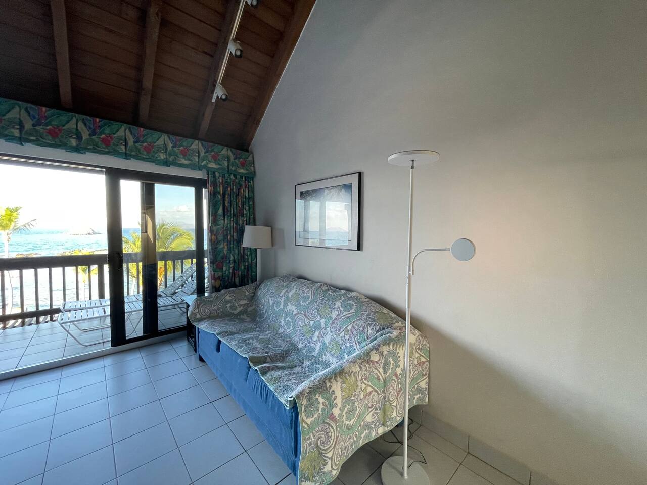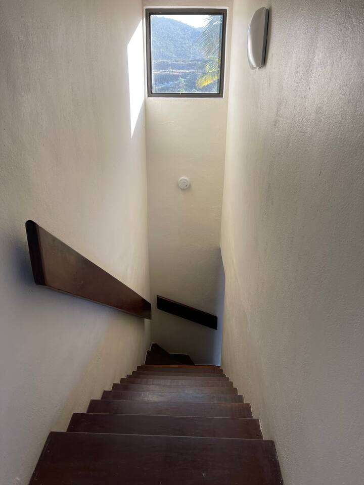 Unit was two floors with kitchen down stairs and master bed up stairs. Also had a pull out couch up stairs but kids decided to sleep down stairs on the couch and futon chair. There were two balconies that faced the water and St. John. Nice place to watch sunrise.